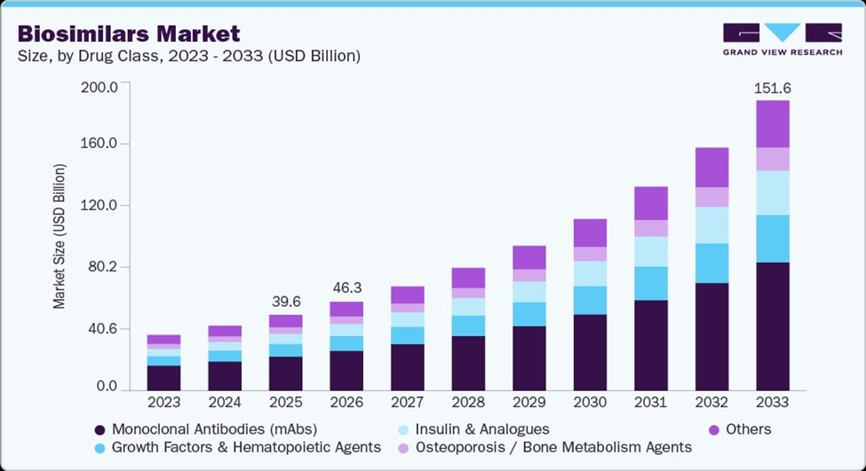 Figure 5: Projected Global Biosimilars Market Growth by Drug Class (2023–2033), illustrating the massive opportunity from the 2025–2030 biologics patent cliff that BioPharma SHAKTI aims to capture for value sovereignty (source: Grand View Research, 2025).
