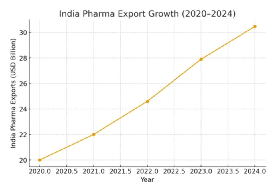 Figure 1: India’s Pharmaceutical Export Growth (2020–2024), illustrating the volume-driven base supporting the pivot to value-based autonomy (source: industry analysis, Eminence Group Ventures, 2025).